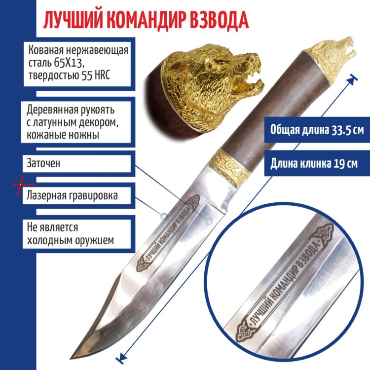 В комплект входят кожаные ножны с креплением, удобные для ношения и хранения. Поверхность клинка может быть украшена тематической гравировкой, что придаёт изделию коллекционную ценность.