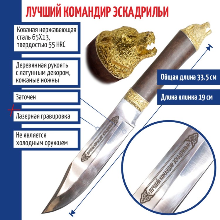 В комплект входят кожаные ножны с креплением, удобные для ношения и хранения. Поверхность клинка может быть украшена тематической гравировкой, что придаёт изделию коллекционную ценность.