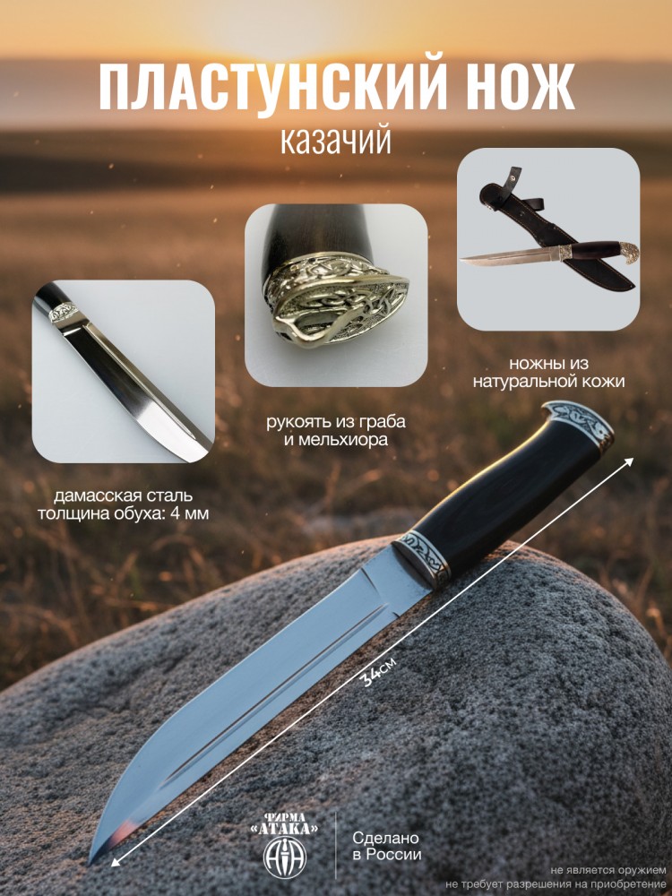Тем не менее, спрос сформировал типаж. Под названием «казачий нож пластун» выпускаются модели с ромбовидным клинком, одним-двумя долами, фигурной рукоятью с загнутым тыльником (опять же, как у шашки) и ножнами с ремешками. Мы не претендуем на историчность, но такие ножи есть и у нас.