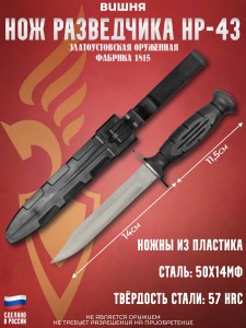 Нож НР 43 «Вишня» популярен среди любителей холодного оружия. Ягодное название клинок получил за прописную букву «Р» (указание на разведку) возле рукояти на старых моделях - будучи перевёрнутой она напоминала схематичное изображение вишенки. Несмотря на устойчиво повышенный интерес к модели, в её истории наблюдается много слепых пятен. Прежде исследователи оружейной тематики полагали, что производство ножа разведчика НР-43 началось в Златоусте (на заводе ЗИК) в годы Великой Отечественной войны. Уже в наши дни компания исследовала архивы и не нашла исчерпывающего подтверждения этому факту - вероятно, клинок стали производить позже, в канун Афганской войны.
