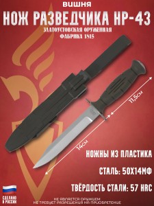 Нож НР 43 «Вишня» популярен среди любителей холодного оружия. Ягодное название клинок получил за прописную букву «Р» (указание на разведку) возле рукояти на старых моделях - будучи перевёрнутой она напоминала схематичное изображение вишенки. Несмотря на устойчиво повышенный интерес к модели, в её истории наблюдается много слепых пятен. Прежде исследователи оружейной тематики полагали, что производство ножа разведчика НР-43 началось в Златоусте (на заводе ЗИК) в годы Великой Отечественной войны. Уже в наши дни компания исследовала архивы и не нашла исчерпывающего подтверждения этому факту - вероятно, клинок стали производить позже, в канун Афганской войны.