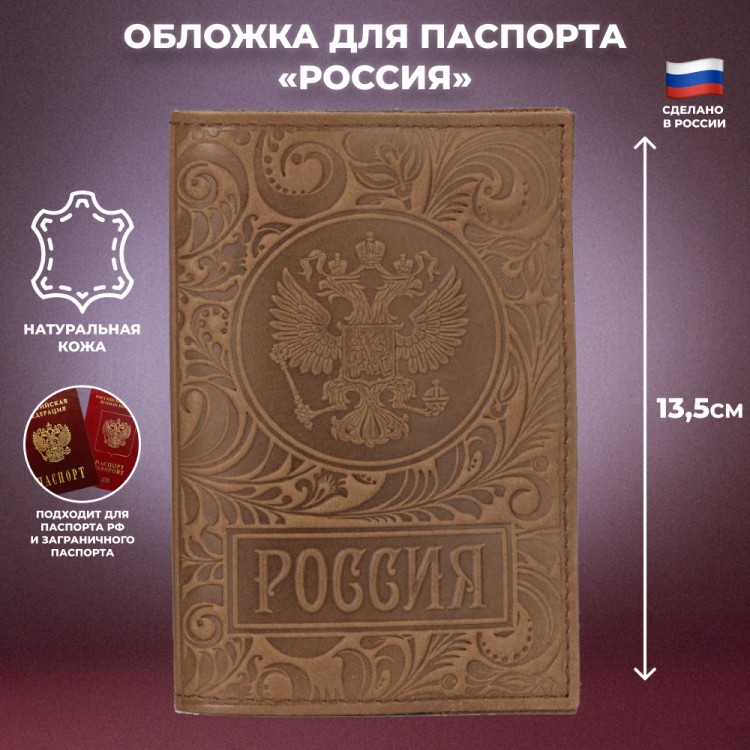 Кожаная обложка на паспорт "Россия" коричневого цвета - описание товара
