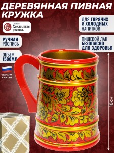 Подарочная деревянная пивная кружка с хохломской росписью прекрасно дополнит коллекцию кубков, фужеров и чашек на кухне. Пригодится на вечеринке, в бане, на работе (для чая, кофе) или для просмотра футбола..