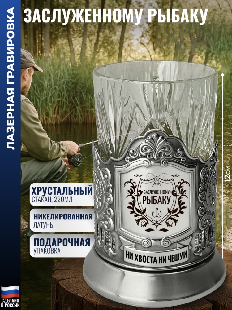 Лазерная гравировка нанесена на лицевую часть. Комплектация: Подстаканник (никелированная латунь марки Л68), Стакан (Хрусталь, 220 мл), Подарочная коробка (15 х 12 х 12 см). Производитель подстаканника: Кольчугинский мельхиор. Стакана: Бахметьевский завод. Высота подстаканника со стаканом: 12 см. Внешний диаметр подстаканника: 7,1 см. Внутренний диаметр подстаканника: 6,7 см. Диаметр наиболее широкой части стакана: 6,6 см. Объём: 220 мл. Вес: 180 г. Размер упаковки: 13 x 9 x 9 см. История подстаканников неразрывно связана с железнодорожным транспортом, где они вместе с граненым стальным стаканом были традиционным элементом сервировки в поездах с советских времен. Атрибут чайных встреч, который тесно связан с атмосферой путешествий и уютом СССР. Подарочный металлические подстаканник дополнит интерьер, служа практической функции, защищая руки от ожога и обеспечивая устойчивость в движении. Каждый фрагмент оформления изображения на железе выполнен методом художественно штамповки. Сувенир станет отличной памятной наградой за заслуги или победы, подходит для корпоративных и личных подарков на 23 февраля, юбилей, Новый год, день рождения и другие значимые события. Оригинальный подарок для мужчин разного возраста (папе, сыну, брату) или статуса (другу, любимому парню, коллеге от коллектива). Актуально в качестве новогоднего сюрприза мужу, отцу, коллеге, начальнику или юбиляру. Рыбак - это не просто человек с удочкой, а мастер терпения, тонкого расчёта и уважения к стихии. Он чувствует воду, понимает рыбу и ценит каждый трофей, независимо от размера. Подчеркнуть его увлечение поможет внимательная идея, отражающая страсть к рыбалке: будь то утренний клёв, трофейный хищник или легенды о несбывшихся сходах. 9150