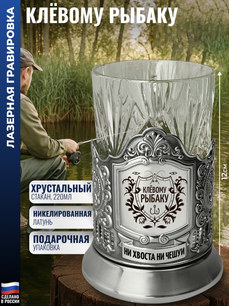 Комплектация: Подстаканник (никелированная латунь марки Л68), Стакан (Хрусталь, 220 мл), Подарочная коробка (15 х 12 х 12 см).