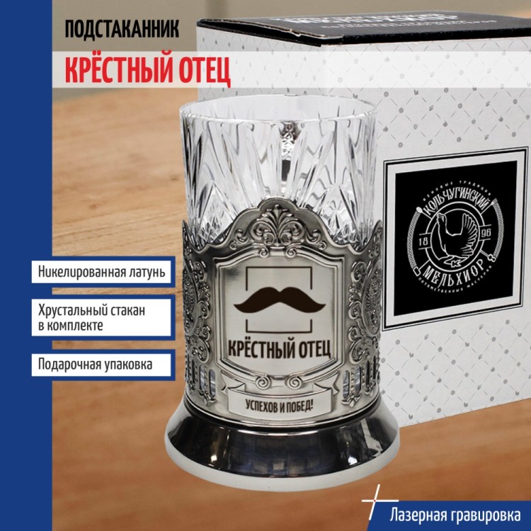 Комплектация: Подстаканник (никелированная латунь марки Л68), Стакан (Хрусталь, 220 мл), Подарочная коробка (15 х 12 х 12 см).