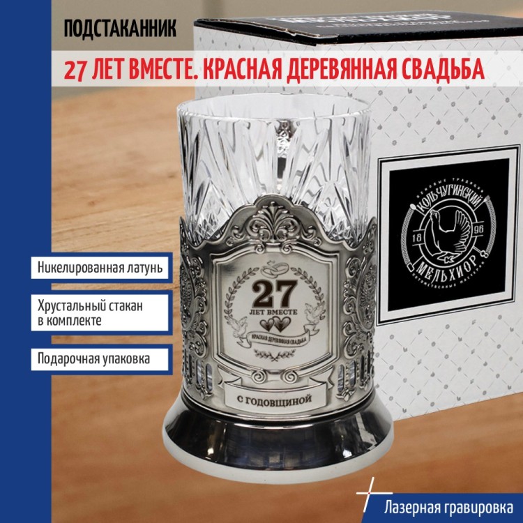 Комплектация: Подстаканник (никелированная латунь марки Л68), Стакан (Хрусталь, 220 мл), Подарочная коробка (15 x 12 x 12 см).