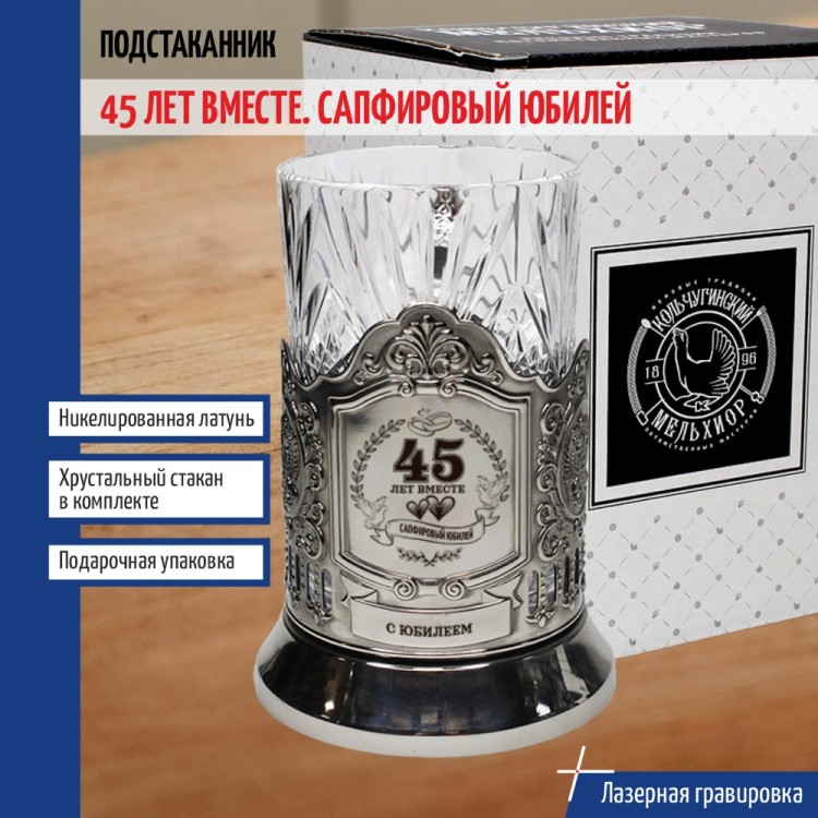 Комплектация: Подстаканник (никелированная латунь марки Л68), Стакан (Хрусталь, 220 мл), Подарочная коробка (15 х 12 х 12 см).