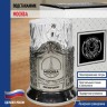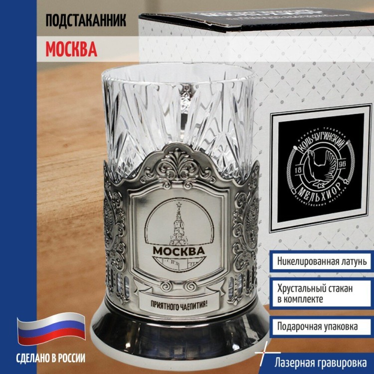 Комплектация: Подстаканник (никелированная латунь марки Л68), Стакан (Хрусталь, 220 мл), Подарочная коробка (15 х 12 х 12 см).