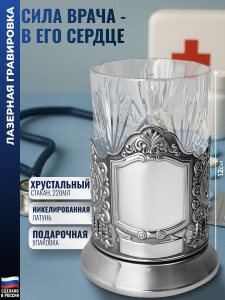 Лазерная гравировка нанесена на лицевую часть. Комплектация: Подстаканник (никелированная латунь марки Л68), Стакан (Хрусталь, 220 мл), Подарочная коробка (15 х 12 х 12 см). Производитель подстаканника: Кольчугинский мельхиор. Стакана: Бахметьевский завод. Высота подстаканника со стаканом: 12 см. Внешний диаметр подстаканника: 7,1 см. Внутренний диаметр подстаканника: 6,7 см. Диаметр наиболее широкой части стакана: 6,6 см. Объём: 220 мл. Вес: 180 г. Размер упаковки: 13 x 9 x 9 см. История подстаканников неразрывно связана с железнодорожным транспортом, где они вместе с граненым стальным стаканом были традиционным элементом сервировки в поездах с советских времен. Атрибут чайных встреч, который тесно связан с атмосферой путешествий и уютом СССР. Подарочный металлические подстаканник дополнит интерьер, служа практической функции, защищая руки от ожога и обеспечивая устойчивость в движении. Каждый фрагмент оформления изображения на железе выполнен методом художественно штамповки. Сувенир станет отличной памятной наградой за заслуги или победы, подходит для корпоративных и личных подарков на 23 февраля, юбилей, Новый год, день рождения и другие значимые события. Оригинальный подарок для мужчин разного возраста (папе, сыну, брату) или статуса (другу, любимому парню, коллеге от коллектива). Актуально в качестве новогоднего сюрприза мужу, отцу, коллеге, начальнику или юбиляру. Медик - человек, которому доверяют самое ценное - здоровье и жизнь. Это профессия мужества, знаний и доброты. Врач, фельдшер или медсестра почувствуют благодарность за свой труд, заботу и профессионализм через внимательный выбор, отражающий уважение к их призванию. 9150