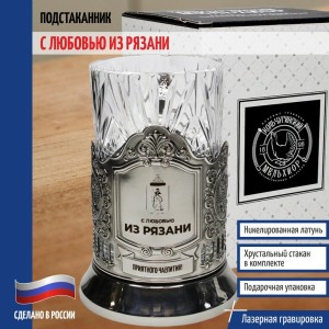 Комплектация: Подстаканник (никелированная латунь марки Л68), Стакан (Хрусталь, 220 мл), Подарочная коробка (15 х 12 х 12 см).