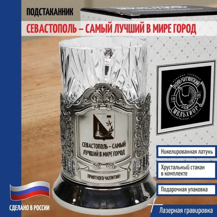Комплектация: Подстаканник (никелированная латунь марки Л68), Стакан (Хрусталь, 220 мл), Подарочная коробка (15 х 12 х 12 см).