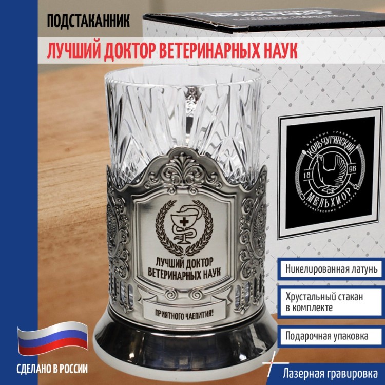 Комплектация: Подстаканник (никелированная латунь марки Л68), Стакан (Хрусталь, 220 мл), Подарочная коробка (15 х 12 х 12 см).