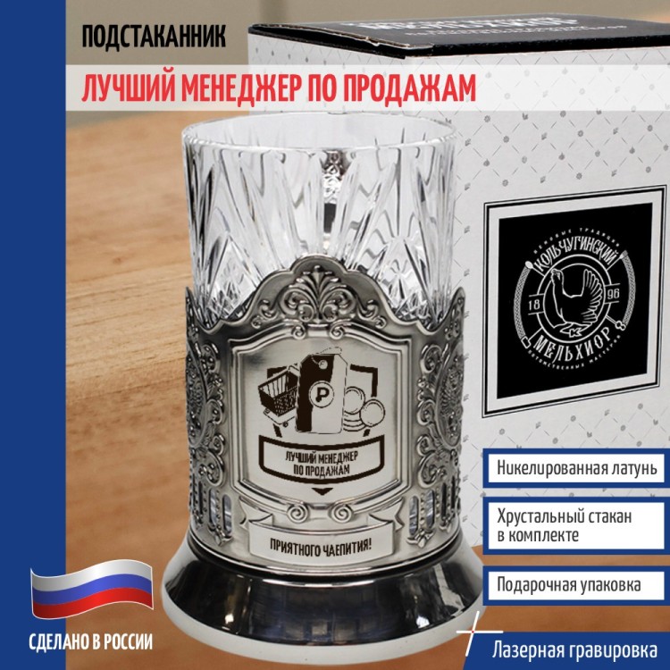 Комплектация: Подстаканник (никелированная латунь марки Л68), Стакан (Хрусталь, 220 мл), Подарочная коробка (15 х 12 х 12 см).