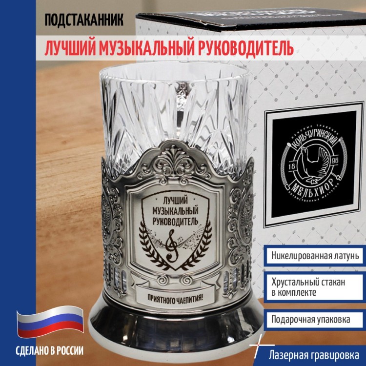 Лазерная гравировка нанесена на лицевую часть. Комплектация: Подстаканник (никелированная латунь марки Л68), Стакан (Хрусталь, 220 мл), Подарочная коробка (15 x 12 x 12 см). Производитель подстаканника: Кольчугинский мельхиор. Стакана: Бахметьевский завод. Высота подстаканника со стаканом: 12 см. Внешний диаметр подстаканника: 7,1 см. Внутренний диаметр подстаканника: 6,7 см. Диаметр наиболее широкой части стакана: 6,6 см. Объём: 220 мл. Вес: 180 г. Размер упаковки: 13 x 9 x 9 см. История подстаканников неразрывно связана с железнодорожным транспортом, где они вместе с граненым стальным стаканом были традиционным элементом сервировки в поездах с советских времен. Атрибут чайных встреч, который тесно связан с атмосферой путешествий и уютом СССР. Подарочный металлические подстаканник дополнит интерьер, служа практической функции, защищая руки от ожога и обеспечивая устойчивость в движении. Каждый фрагмент оформления изображения на железе выполнен методом художественно штамповки. Считается хорошим подарком как для мужчин (сыну, брату, отцу), так и для женщин (дочери, сестре, маме). Сувенир подходит для множества знаковых дат и событий: юбилеи родителей, международный женский день (8 марта), 14 и 23 февраля, Новый год или на день рождения (ДР). Отличный подарок музыканту любого уровня - от меломана самоучки до профессионального эстрадника. Подходит для важных событий: концерт, экзамен, конкурс или выступление в филармонии. Универсальное решение для композитора, дирижера и исполнителя разных направлений. Оценят как опытный маэстро классической музыки и культуры консерваторий, так и юный музыкант-самоучка, любитель импровизатор или инструменталист. Станет значимым презентом для всех, кто связан с музыкальным искусством. Поможет выразить уважение к таланту получателя, как знак признания его виртуозности. 9150