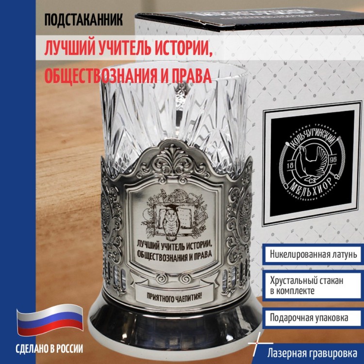 Комплектация: Подстаканник (никелированная латунь марки Л68), Стакан (Хрусталь, 220 мл), Подарочная коробка (15 x 12 x 12 см).
