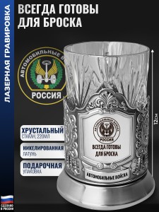 Комплектация: Подстаканник (никелированная латунь марки Л68), Стакан (Хрусталь, 220 мл), Подарочная коробка (15 x 12 x 12 см).