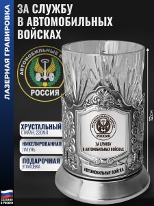 Комплектация: Подстаканник (никелированная латунь марки Л68), Стакан (Хрусталь, 220 мл), Подарочная коробка (15 х 12 х 12 см).