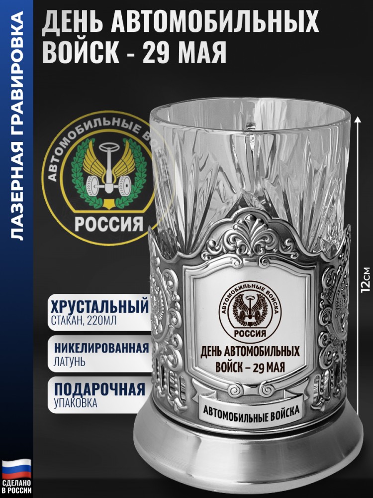 Комплектация: Подстаканник (никелированная латунь марки Л68), Стакан (Хрусталь, 220 мл), Подарочная коробка (15 х 12 х 12 см).