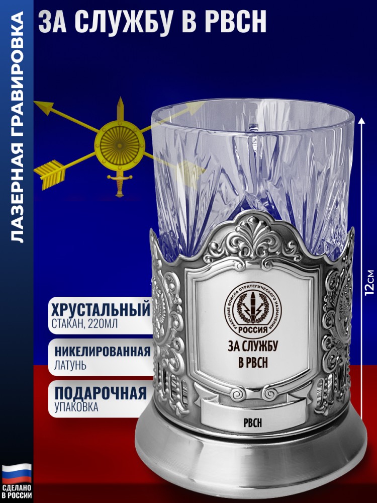 Комплектация: Подстаканник (никелированная латунь марки Л68), Стакан (Хрусталь, 220 мл), Подарочная коробка (15 х 12 х 12 см).