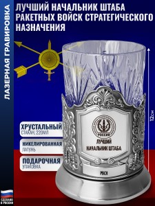 Комплектация: Подстаканник (никелированная латунь марки Л68), Стакан (Хрусталь, 220 мл), Подарочная коробка (15 х 12 х 12 см).