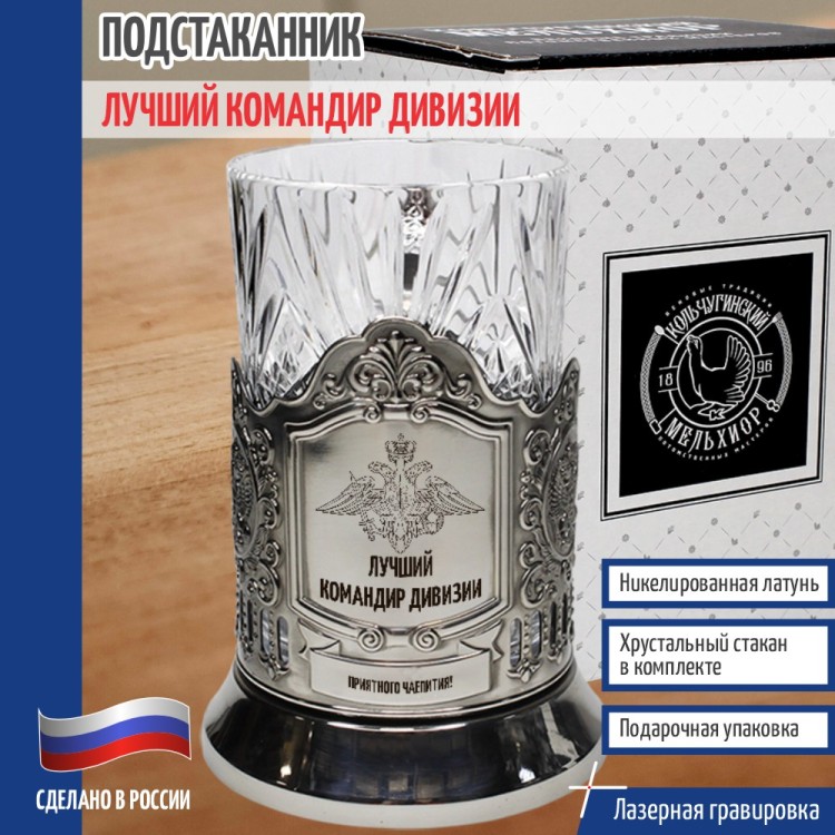Комплектация: Подстаканник (никелированная латунь марки Л68), Стакан (Хрусталь, 220 мл), Подарочная коробка (15 x 12 x 12 см).