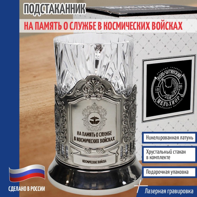 Лазерная гравировка нанесена на лицевую часть. Комплектация: Подстаканник (никелированная латунь марки Л68), Стакан (Хрусталь, 220 мл), Подарочная коробка (15 x 12 x 12 см). Производитель подстаканника: Кольчугинский мельхиор. Стакана: Бахметьевский завод. Высота подстаканника со стаканом: 12 см. Внешний диаметр подстаканника: 7,1 см. Внутренний диаметр подстаканника: 6,7 см. Диаметр наиболее широкой части стакана: 6,6 см. Объём: 220 мл. Вес: 180 г. Размер упаковки: 13 x 9 x 9 см. История подстаканников неразрывно связана с железнодорожным транспортом, где они вместе с граненым стальным стаканом были традиционным элементом сервировки в поездах с советских времен. Атрибут чайных встреч, который тесно связан с атмосферой путешествий и уютом СССР. Подарочный металлические подстаканник дополнит интерьер, служа практической функции, защищая руки от ожога и обеспечивая устойчивость в движении. Каждый фрагмент оформления изображения на железе выполнен методом художественно штамповки. Сувенир актуален в качестве подарка мужу, взрослому родственнику (отцу, дедушке) или для сослуживца. Актуально на 23 февраля, дембель или день рождения. Космические войска - род войск Воздушно-космических сил России (ВКС), отвечающий за безопасность и контроль в околоземном пространстве. Основные задачи КВ: мониторинг спутников, защита от угроз, обеспечение связи и навигации. Дарят к профессиональному празднику, дате формирования части или по случаю награждения, от сослуживца или командира. Актуально в День Космических войск России (4 октября), в честь повышения по военной службе или в знак признания заслуг. 9150