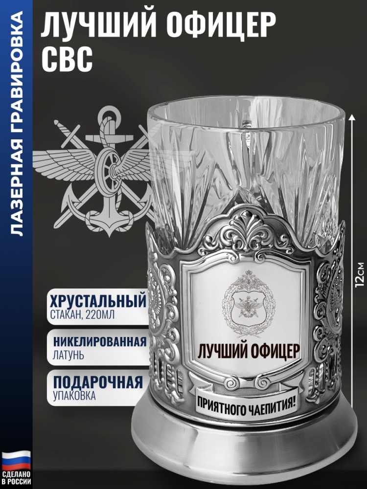 Лазерная гравировка нанесена на лицевую часть. Комплектация: Подстаканник (никелированная латунь марки Л68), Стакан (Хрусталь, 220 мл), Подарочная коробка (15 x 12 x 12 см). Производитель подстаканника: Кольчугинский мельхиор. Стакана: Бахметьевский завод. Высота подстаканника со стаканом: 12 см. Внешний диаметр подстаканника: 7,1 см. Внутренний: 6,7 см. Диаметр широкой части стакана: 6,6 см. Объём: 220 мл. Вес: 180 г. Упаковка: 13 x 9 x 9 см. История подстаканников неразрывно связана с железнодорожным транспортом, где они вместе с граненым стальным стаканом были традиционным элементом сервировки в поездах. Подарочный металлические подстаканник дополнит интерьер, служа практической функции, защищая руки от ожога и обеспечивая устойчивость в движении. Каждый фрагмент оформления изображения на железе выполнен методом художественно штамповки. Подарок для военного специалиста частей железнодорожных войск и инфраструктуры. Подойдёт и офицеру ВОСО (на день войск военных сообщений - 18 июня), железнодорожнику, логисту или коменданту, организующему этапные маршруты на любом виде транспорта - железнодорожном, воздушном и других. В советское время эти две службы были объединены в одну - специальные войска в составе Тыла вооруженных сил ЖДВ СССР. Подойдёт для награждения ветерана или доблестного война-железнодорожника, строителя БАМа или в день железнодорожных войск - 6 августа. Отличный презент преподавателю, научному сотруднику Минобороны в благодарность за вклад в мобилизационную подготовку и развитие транспортного сообщения. ЖДВ подчинялись Главному управлению железнодорожных войск (ГУЖВ) и выполняли работы по проектированию, постройке, эксплуатации, обслуживанию и обеспечивающего бесперебойную работу путей для нужд армии. В их состав входили корпуса, батальоны, полки, роты, взвода и отделения. 9150