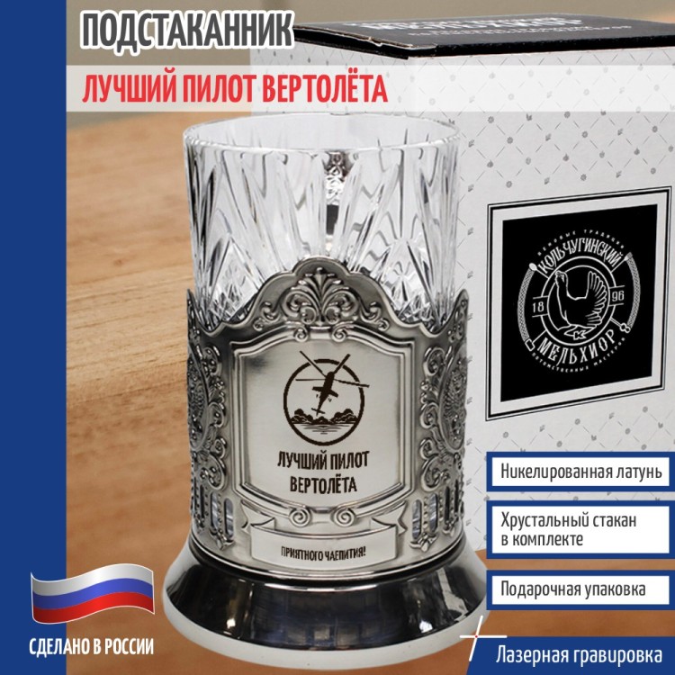 Лазерная гравировка нанесена на лицевую часть. Комплектация: Подстаканник (никелированная латунь марки Л68), Стакан (Хрусталь, 220 мл), Подарочная коробка (15 x 12 x 12 см). Производитель подстаканника: Кольчугинский мельхиор. Стакана: Бахметьевский завод. Высота подстаканника со стаканом: 12 см. Внешний диаметр подстаканника: 7,1 см. Внутренний диаметр подстаканника: 6,7 см. Диаметр наиболее широкой части стакана: 6,6 см. Объём: 220 мл. Вес: 180 г. Размер упаковки: 13 x 9 x 9 см. История подстаканников неразрывно связана с железнодорожным транспортом, где они вместе с граненым стальным стаканом были традиционным элементом сервировки в поездах с советских времен.. Оригинальный подарок для мужчин разного возраста (папе, сыну, брату) или статуса (другу, любимому парню, коллеге от коллектива). Актуально в качестве новогоднего сюрприза мужу, отцу, коллеге, начальнику или юбиляру. Лётчики, он же вертолётчики (часто ошибочно называют как пилотов), управляют военными вертолётами в составе боевой и тыловой авиации. Существуют разные типы машин - военно-транспортные, грузовые и боевые вертолёты, которые могут быть воздушными, морскими, палубными, береговыми или водными, входящие в состав военно-воздушных сил или армейской авиации воздушно-космических сил. Подарок вертолётчику военной авиации будет уместен для всех, кто связан с военными вертолётами, боевыми операциями и авиацией мирного назначения (для обучения и тренировок). Оригинальный подарок на любой праздник или награждение. Лучший пилот вертолёта демонстрирует не только технические навыки, но и способность быстро принимать решения. Такой специалист ценится в различных сферах, от транспортных перевозок до спасательных операций. 9150