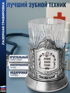 Комплектация: Подстаканник (никелированная латунь марки Л68), Стакан (Хрусталь, 220 мл), Подарочная коробка (15 x 12 x 12 см).