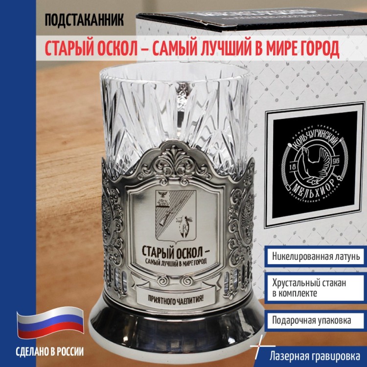 Комплектация: Подстаканник (никелированная латунь марки Л68), Стакан (Хрусталь, 220 мл), Подарочная коробка (15 х 12 х 12 см).