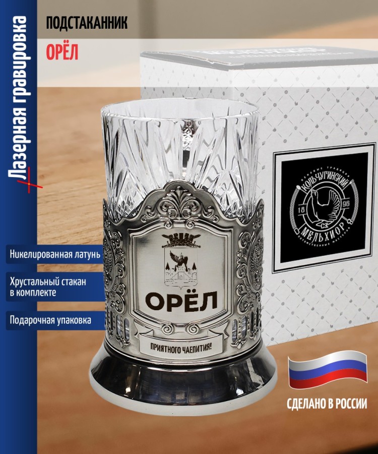 Комплектация: Подстаканник (никелированная латунь марки Л68), Стакан (Хрусталь, 220 мл), Подарочная коробка (15 х 12 х 12 см).