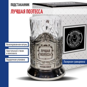Комплектация: Подстаканник (никелированная латунь марки Л68), Стакан (Хрусталь, 220 мл), Подарочная коробка (15 x 12 x 12 см).