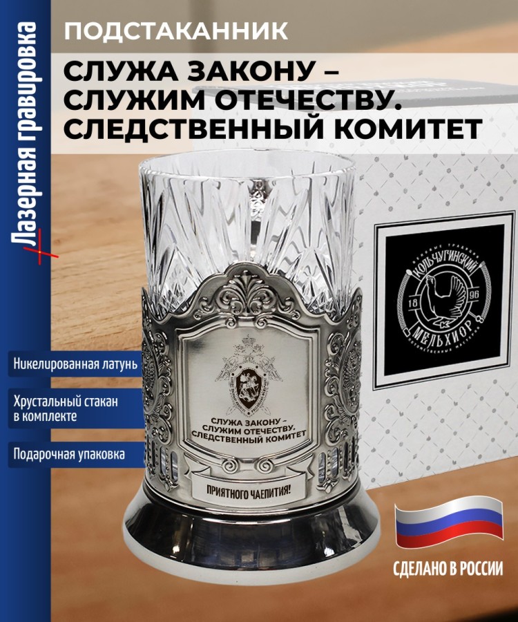Комплектация: Подстаканник (никелированная латунь марки Л68), Стакан (Хрусталь, 220 мл), Подарочная коробка (15 x 12 x 12 см).