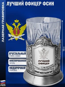 Комплектация: Подстаканник (никелированная латунь марки Л68), Стакан (Хрусталь, 220 мл), Подарочная коробка (15 х 12 х 12 см).