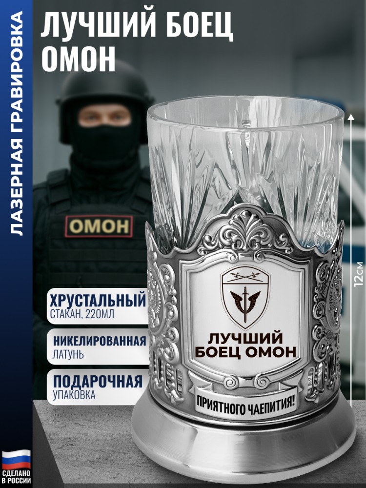 Лазерная гравировка нанесена на лицевую часть. Комплектация: Подстаканник (никелированная латунь марки Л68), Стакан (Хрусталь, 220 мл), Подарочная коробка (15 х 12 х 12 см). Производитель подстаканника: Кольчугинский мельхиор. Стакана: Бахметьевский завод. Высота подстаканника со стаканом: 12 см. Внешний диаметр подстаканника: 7,1 см. Внутренний диаметр подстаканника: 6,7 см. Диаметр наиболее широкой части стакана: 6,6 см. Объём: 220 мл. Вес: 180 г. Размер упаковки: 13 x 9 x 9 см. История подстаканников неразрывно связана с железнодорожным транспортом, где они вместе с граненым стальным стаканом были традиционным элементом сервировки в поездах с советских времен. Атрибут чайных встреч, который тесно связан с атмосферой путешествий и уютом СССР. Подарочный металлические подстаканник дополнит интерьер, служа практической функции, защищая руки от ожога и обеспечивая устойчивость в движении. Каждый фрагмент оформления изображения на железе выполнен методом художественно штамповки. Оригинальный подарок, который подойдет на любой праздник или награждение. Он станет достойной памятной наградой за победы и достижения от коллектива на память. Сувенир символизирует не только личные успехи, но и благодарность за труд и преданность делу. Актуально в качестве новогоднего сюрприза мужу, отцу, взрослому родственнику, преподавателю или юбиляру. Считается хорошим корпоративным подарком как для мужчин (папе, дедушке, руководителю, сыну подростку, брату, другу, любимому парню, начальнику). Подарок сотруднику ОМОН - бойцу спецподразделения, силовику или спецназовцу, выполняющему задачи в условиях повышенного риска. Подходит для действующего омоновца, курсанта или ветерана МВД. Уместен ко Дню ОМОН (27 марта), при награждении, выходе на пенсию или как знак признания за отвагу, стойкость и преданность службе в спецподразделениях. 9150