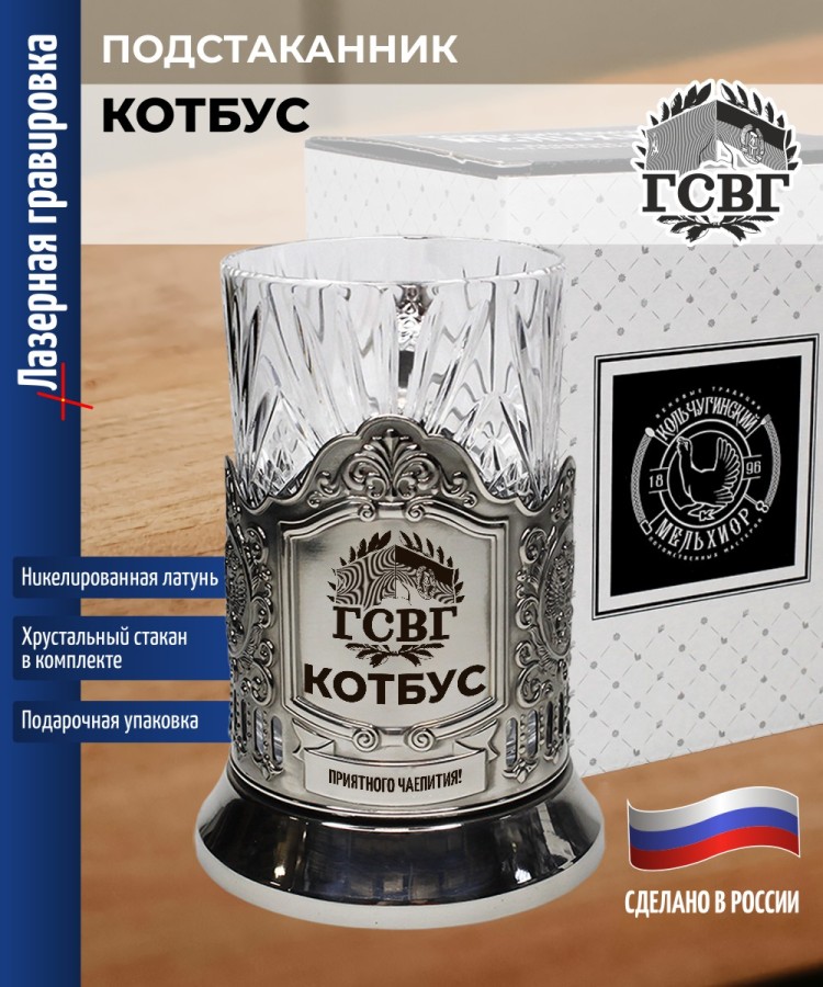 Комплектация: Подстаканник (никелированная латунь марки Л68), Стакан (Хрусталь, 220 мл), Подарочная коробка (15 х 12 х 12 см). Производитель подстаканника: Кольчугинский мельхиор (г. Кольчугино, Владимирская обл., Россия). Производитель стакана: Бахметьевский завод (г. Никольск, Пензенская обл., РФ). Способ нанесения рисунка: Лазерная гравировка (нанесена на лицевую часть). Размер: 12 x 10 x 8 см. Высота подарочного подстаканника со стаканом: 12 см. Внешний диаметр подстаканника: 7,1 см., Внутренний: 6,7 см. Диаметр наиболее широкой части стакана: 6,6 см. История подстаканников неразрывно связана с железнодорожным транспортом, где они вместе с граненым стаканом стали неотъемлемым элементом сервировки стола в поездах еще с советских времен. Оригинальный подарок, который подойдет на любой праздник или награждение. Актуально в качестве новогоднего сюрприза мужу, отцу, взрослому родственнику, преподавателю или юбиляру. Подходит для множества знаковых дат и событий, таких как юбилеи родителей, 23 февраля, Новый год, день рождения (ДР) и другие торжества. Считается хорошим корпоративным подарком как для мужчин (папе, дедушке, руководителю, сыну подростку, брату, другу, любимому парню, начальнику), так и для женщин. Подарок ветерану ГСВГ - представителю Группы советских войск в Германии, служившему в составе объединений, соединений, частей и учреждений, входивших в структуру Вооружённых Сил СССР. Подходит для военного, проходившего службу в Западной группе войск (ГСОВГ, ГСВГ, ЗГВ) на территории ГДР, в составе армии СССР или РККА. Актуален по случаю юбилея службы, памятной даты, награждения или как символ уважения к поколению, обеспечивавшему стабильность и военное присутствие за границей. Такой сувенир подчеркнёт значимость вклада, сохранит память о гарнизоне, боевом пути и товарищах по службе. 9150