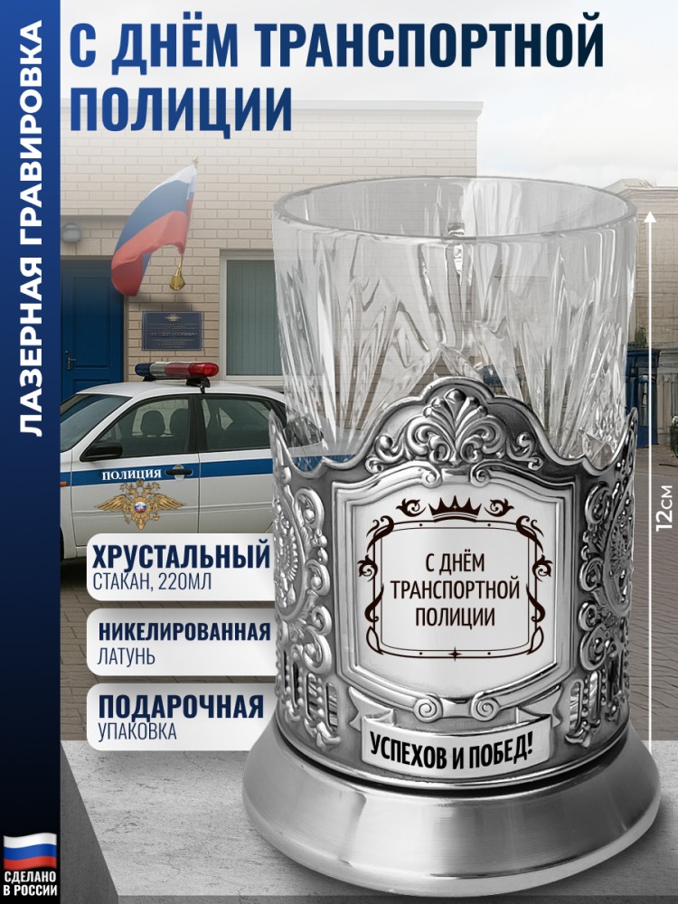 Комплектация: Подстаканник (никелированная латунь марки Л68), Стакан (Хрусталь, 220 мл), Подарочная коробка (15 x 12 x 12 см).