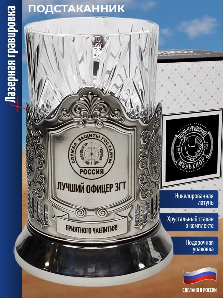 Лазерная гравировка нанесена на лицевую часть. Комплектация: Подстаканник (никелированная латунь марки Л68), Стакан (Хрусталь, 220 мл), Подарочная коробка (15 x 12 x 12 см). Производитель подстаканника: Кольчугинский мельхиор. Стакана: Бахметьевский завод. Высота подстаканника со стаканом: 12 см. Внешний диаметр подстаканника: 7,1 см. Внутренний диаметр подстаканника: 6,7 см. Диаметр наиболее широкой части стакана: 6,6 см. Объём: 220 мл. Вес: 180 г. Размер упаковки: 13 x 9 x 9 см. История подстаканников неразрывно связана с железнодорожным транспортом, где они вместе с граненым стальным стаканом были традиционным элементом сервировки в поездах с советских времен. Атрибут чайных встреч, который тесно связан с атмосферой путешествий и уютом СССР. Подарочный металлические подстаканник дополнит интерьер, служа практической функции, защищая руки от ожога и обеспечивая устойчивость в движении. Каждый фрагмент оформления изображения на железе выполнен методом художественно штамповки. Сувенир станет отличной памятной наградой за заслуги или победы, подходит как взрослым мужчинам (папе, дедушке, руководителю и начальнику) так и молодым парням (сыну подростку, брату, другу, любимому). Также актуально в качестве подарка и для взрослых женщин (маме, бабушке, коллеге, начальнице) или юным девушкам (дочери, сестре, подруге или любимой) Служба защиты государственной тайны обеспечивает сохранность важных сведений, предотвращая их утечку. Уместен как презент для военных it-специалистов в сфере безопасности данных, защиты информации и программировании. Сотрудники структуры ЗГТ следят за соблюдением режима секретности и контролируют доступ к конфиденциальной информации. Их работа требует высокой ответственности и профессионализма в навыках шифрования и дешифрования. Подчёркивает интерес к сложным техническим задачам и аналитическому мышлению. Актуален как для профессионалов, так и для энтузиастов, изучающих методы различной криптографии в День военного шифровальщика - 13 ноября. Подчёркивает важность профессии в цифровую эпоху. 9150