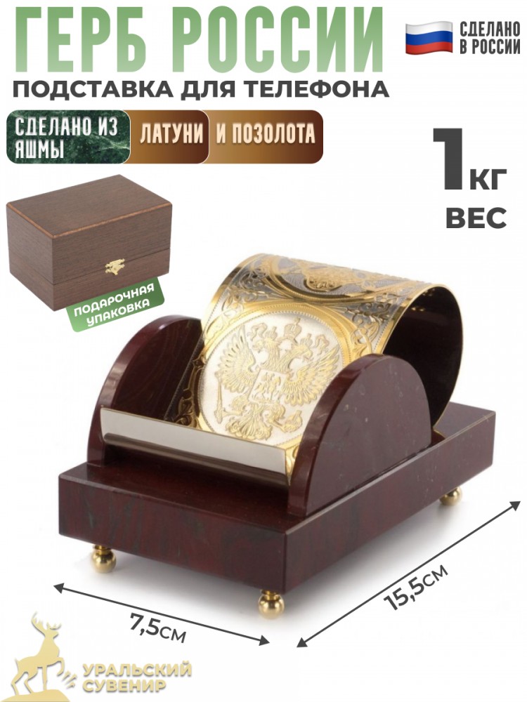 Элегантность яшмы и блеск золота. Эта подставка для телефона украшена техникой златоустовской гравюры, создавая неповторимый акцент на вашем столе.