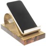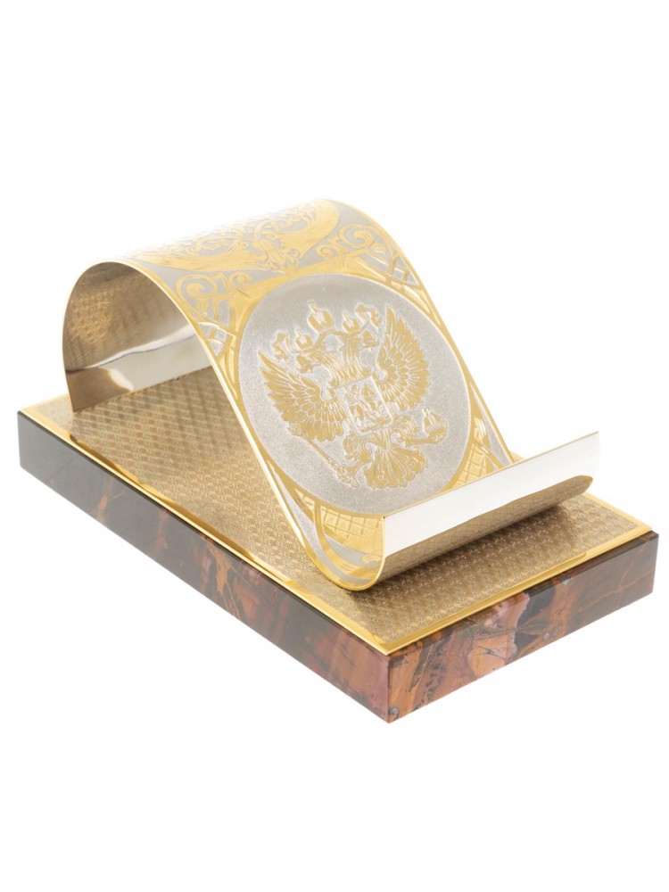 Элегантность яшмы и блеск золота. Эта подставка для телефона украшена техникой златоустовской гравюры, создавая неповторимый акцент на вашем столе.