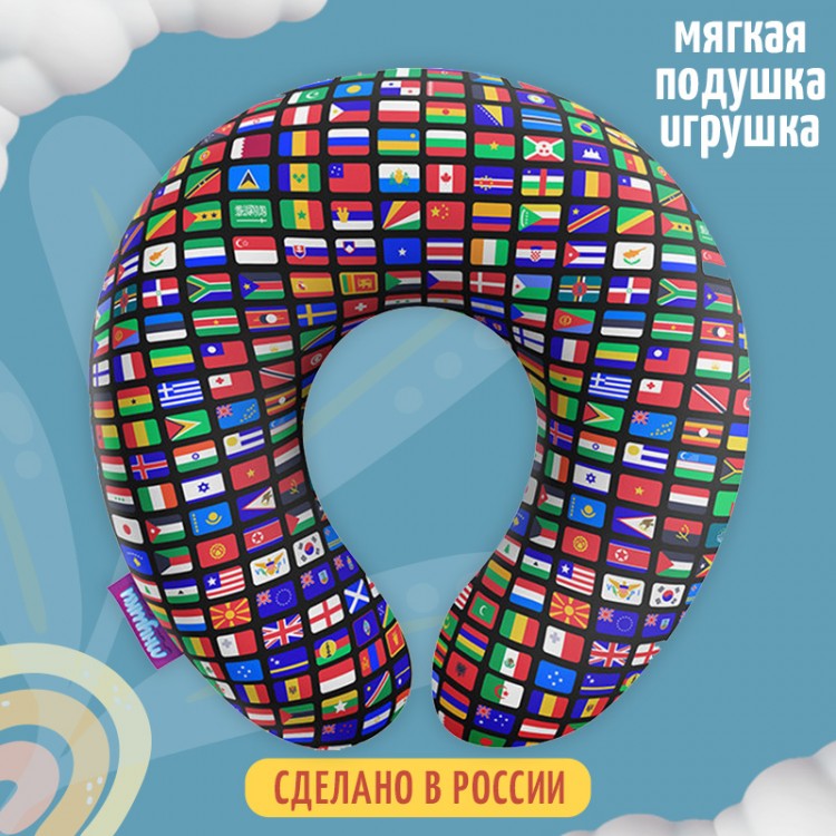 Подушка-рогалик оформлена в стиле международной символики - с изображениями национальных флагов различных государств. Подходит для любителей путешествий, студентов, школьников, изучающих географию, сотрудников интернациональных и транснациональных компаний, а также в качестве сувенира или подарка тем, кто интересуется культурой и историей разных стран.