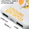 Комплектация: Внешний аккумулятор (пауэрбанк), Кабель с разъёмами Micro USB, Type-C, Lightning (под iPhone).