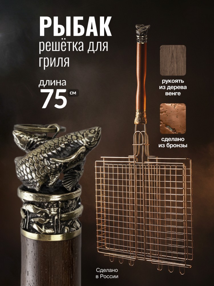 Роскошная бронзовая решетка для гриля с деревянной ручкой, украшенная тематикой рыбалки, станет центральным предметом любого пикника.
