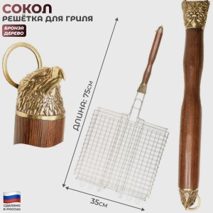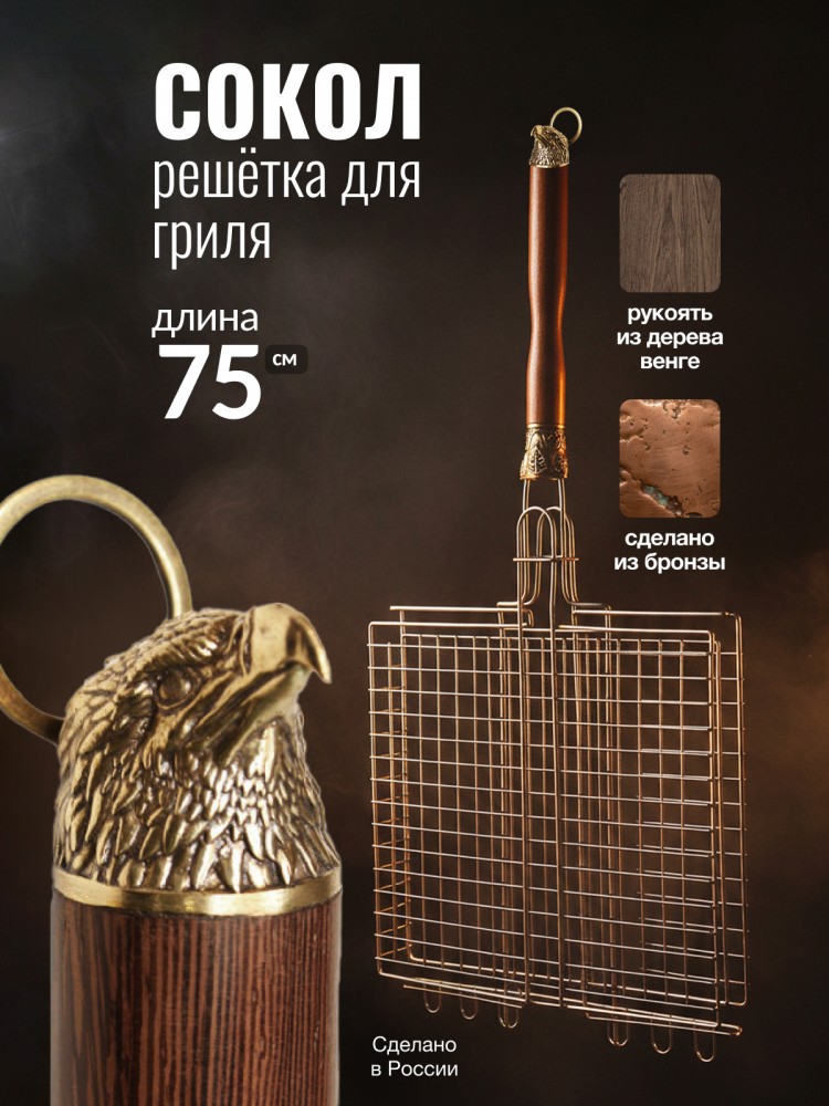 Эксклюзивная бронзовая гриль-решетка с деревянной ручкой, декорированная изображением сокола, подарит незабываемые впечатления от приготовления блюд на открытом воздухе.