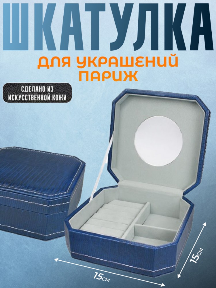Материал упаковки: под кожу аллигатора Цвет: синий Цвет вкладыша: ванильный Материал вкладыша: замша Конструкция: зеркало, валики, отделочная строчка