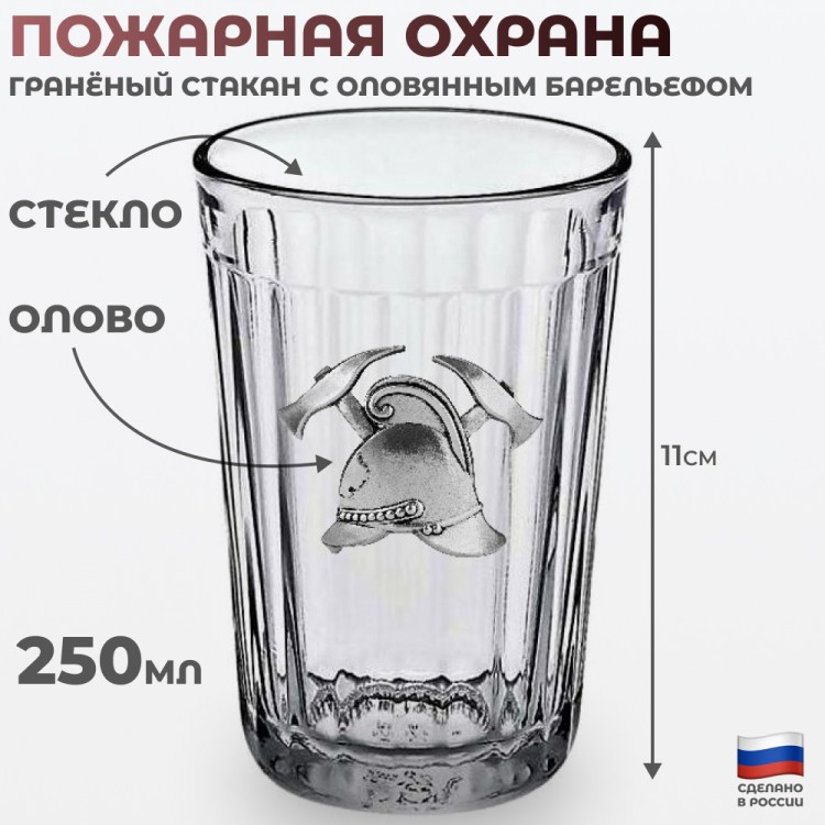 Памятный гранёный стакан с оловянным барельефом «Пожарная охрана» - выразительный подарок, символизирующий уважение к профессии и мужеству пожарных.