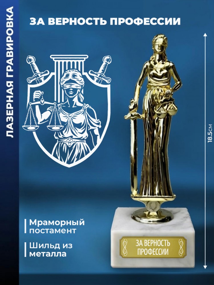 Лазерная гравировка нанесена на металлическую табличку, приклеенную к каменной подставке. Размер: 18,5 x 6,5 x 6,5 см. Высота фигурки: 15,5 см. Размер постамента: 6,5 x 6,5 x 3 см. Размер шильдика (с надписью): 5 x 1,7 см. Материал: Пластик (Статуэтка), Мрамор (постамент). Вес: 360 граммов. Упаковка: Картонная коробка. Символ справедливости и мудрости, напоминающий о важности закона и порядка. Сувенир станет отличной памятной наградой за заслуги или победы. Он подходит для корпоративных и личных наград, на юбилей или Новый год Актуально как подарок в качестве сюрприза от коллектива, друзей и близких на день рождения и другие значимые события. Фемида - олицетворение правосудия, несущая весы закона и справедливости. Этот образ глубоко связан с юриспруденцией, символизируя равновесие и беспристрастность решений. Юрист, судья, адвокат или преподаватель права может почувствовать уважение через символ, подчёркивающий профессиональную миссию. День юриста (3 декабря) - важная дата для сообщества правоведов. 2655