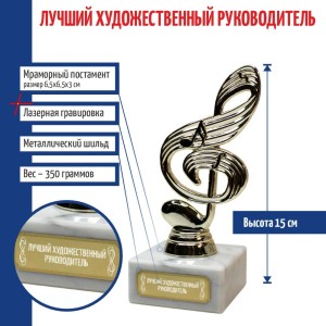 Фигурка соль-ключа акцентирует внимание на артистизме, таланте и участии в культурных событиях. Сувенирная награда фиксирует вклад в искусство и символизирует уважение к музыке.
