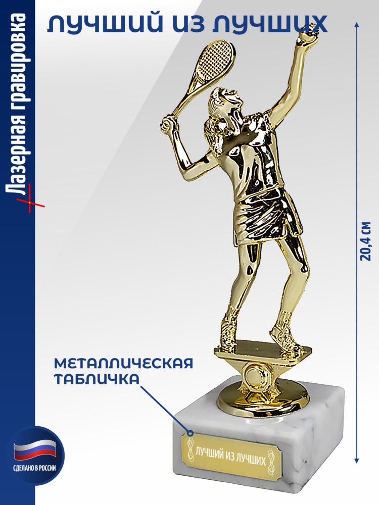 Наградная статуэтка с фигурой теннисистки на мраморной подставке - спортивный трофей для участниц клубных турниров, соревнований и тематических мероприятий. Уместна как приз за личные достижения на корте.